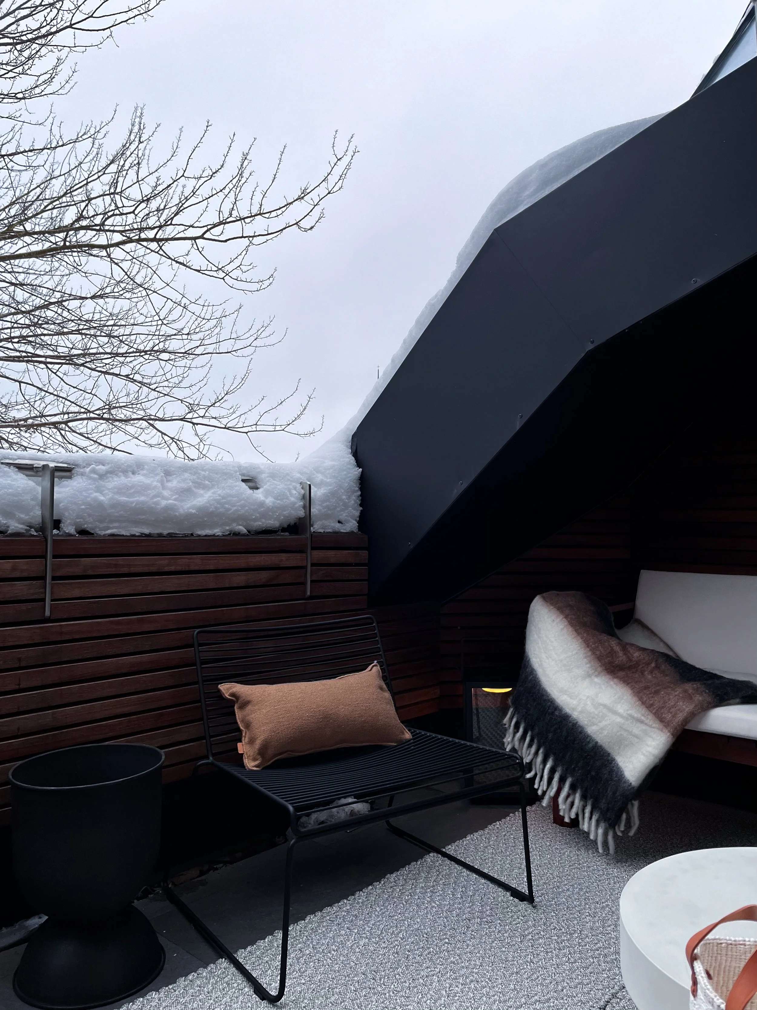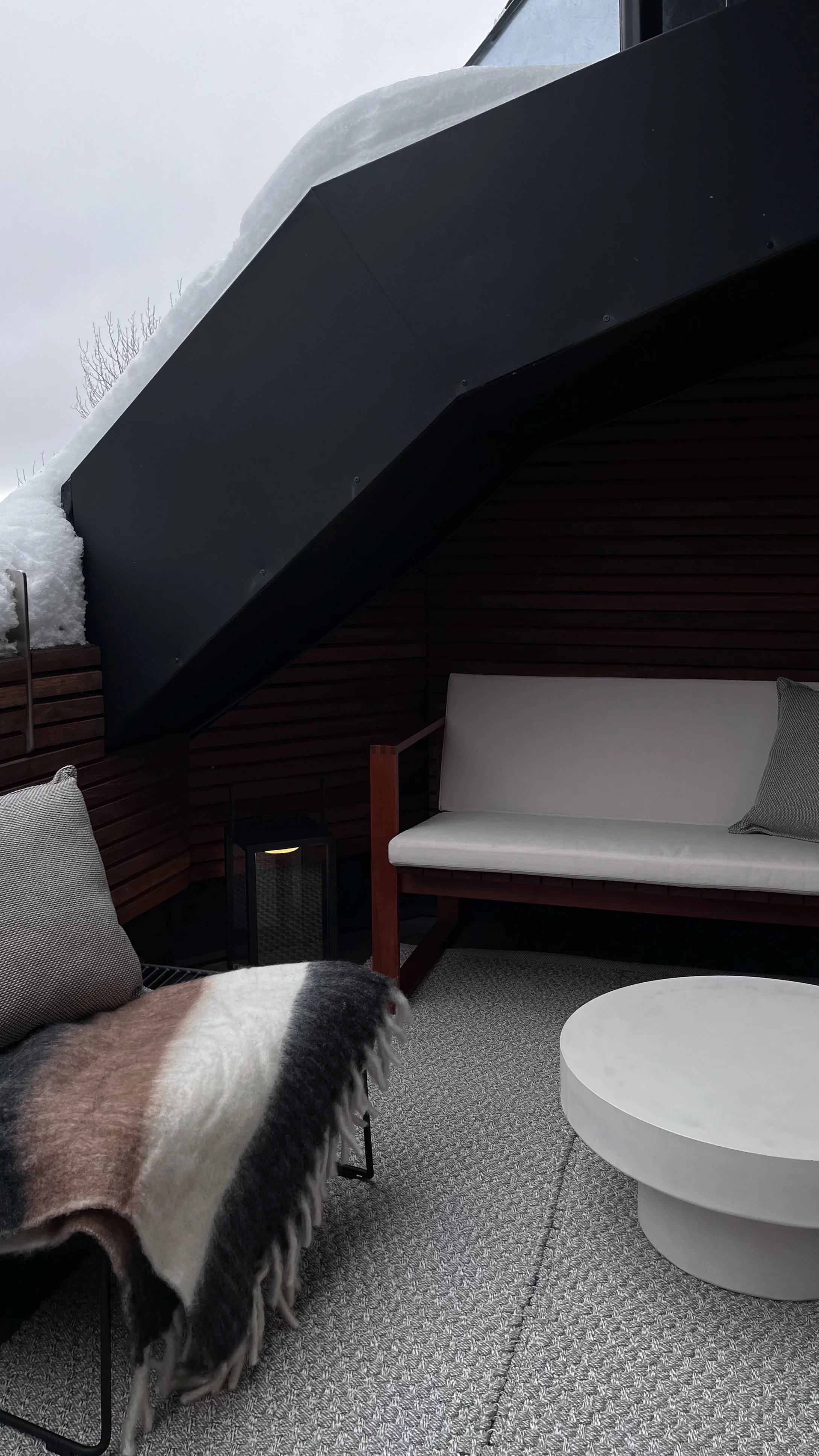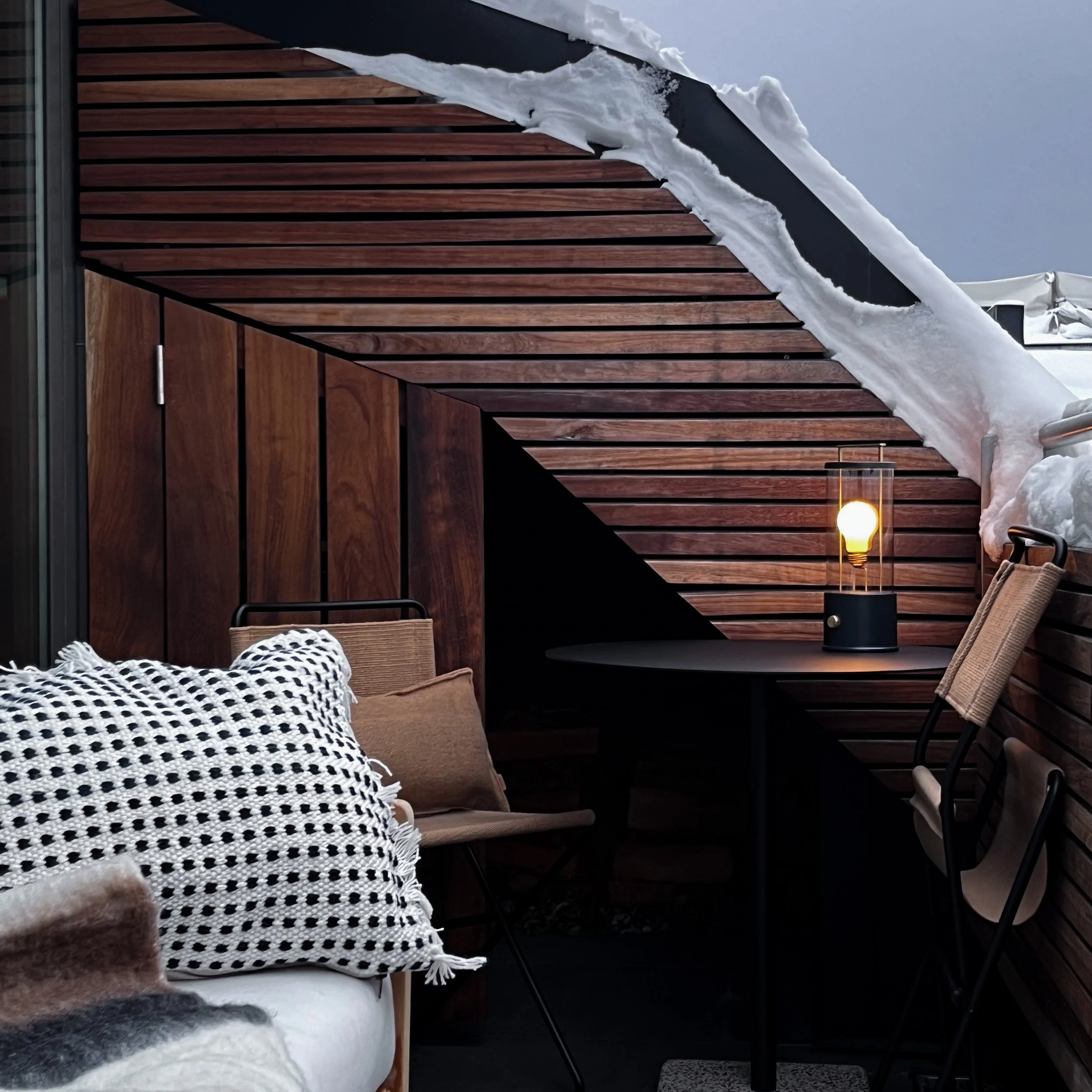 Functionality is also taken into consideration in the selection of fabrics. The sofa and chair upholstery are designed for outdoors to prevent any mould or unpleasant marks from developing.